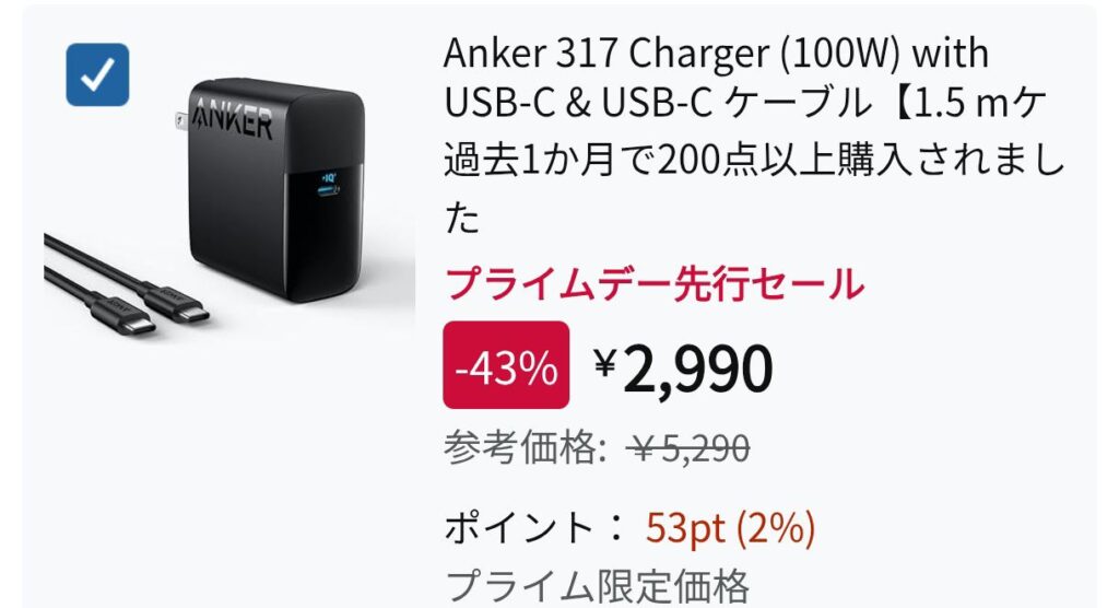 泣く子も黙るAnkerブランドのPD充電器です!100W出力に対応しており1.5mのTypeCケーブルが付属して2,990円!過去最安値の価格でありながら安心して使用することができ非常におすすめです!