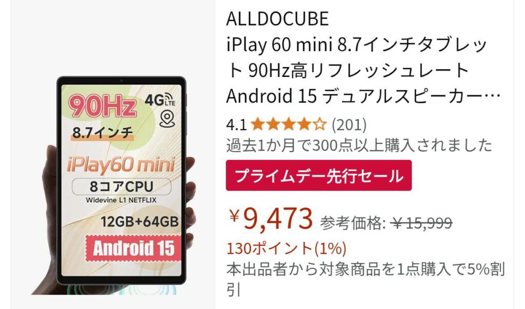 ALLDOCUBEのiPlay 60 mimiになります!メモリが4GB,容量が64GBで画面のリフレッシュレートが90Hzとなっています。こちらは4G通信にも対応しており、車でのナビ用途などにも最適だと思います。また、値段と画面サイズ的にごろ寝用途にも合いそうです。
