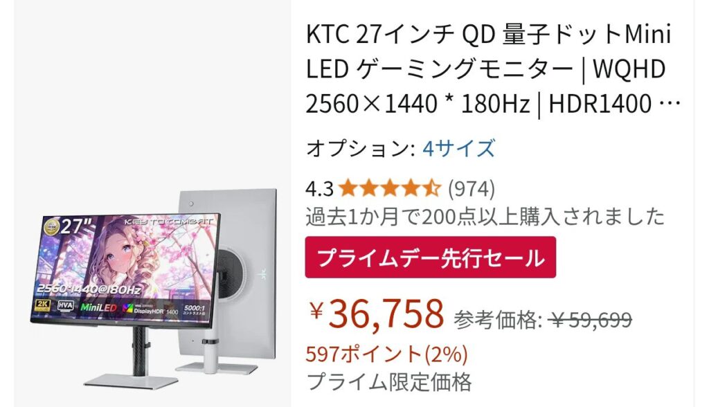 セール価格の36,758円から更に下記のクーポンとポイント還元で31779円になります!モニターのスペックを考えるとありえない破格値なのでおすすめです!