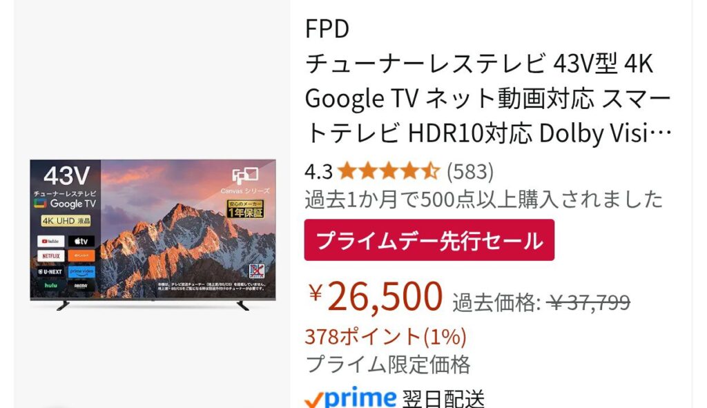 普通に考えて43V型の4Kテレビが26500円で買えるってなに!?冗談じゃなくて!?って感じだと思います。大きめのパソコンモニター用途やアニメ、映画視聴用としてすごくおすすめです。
